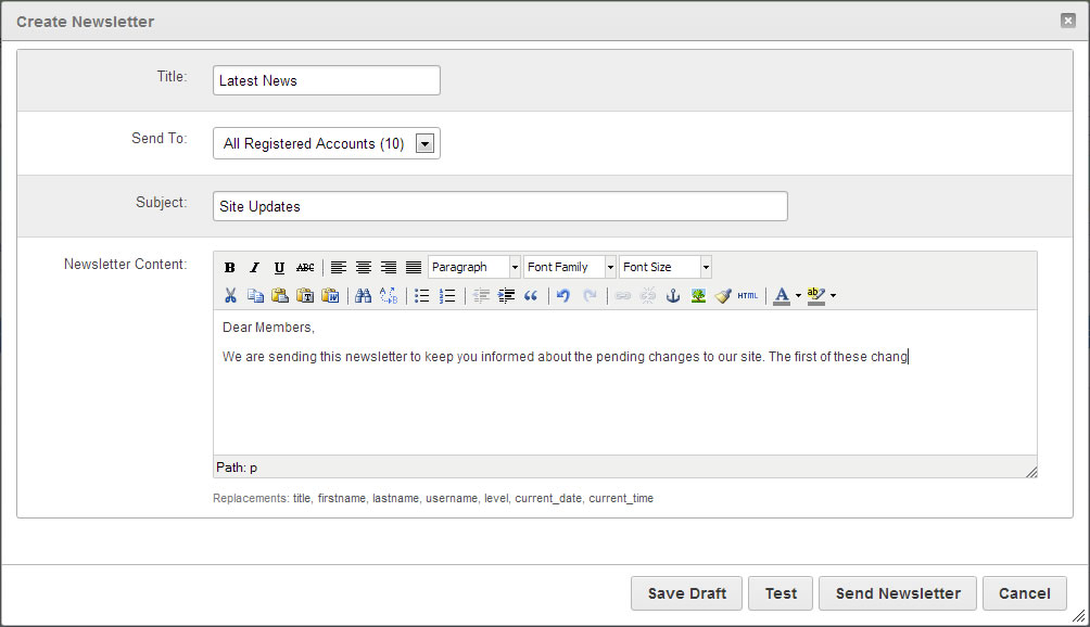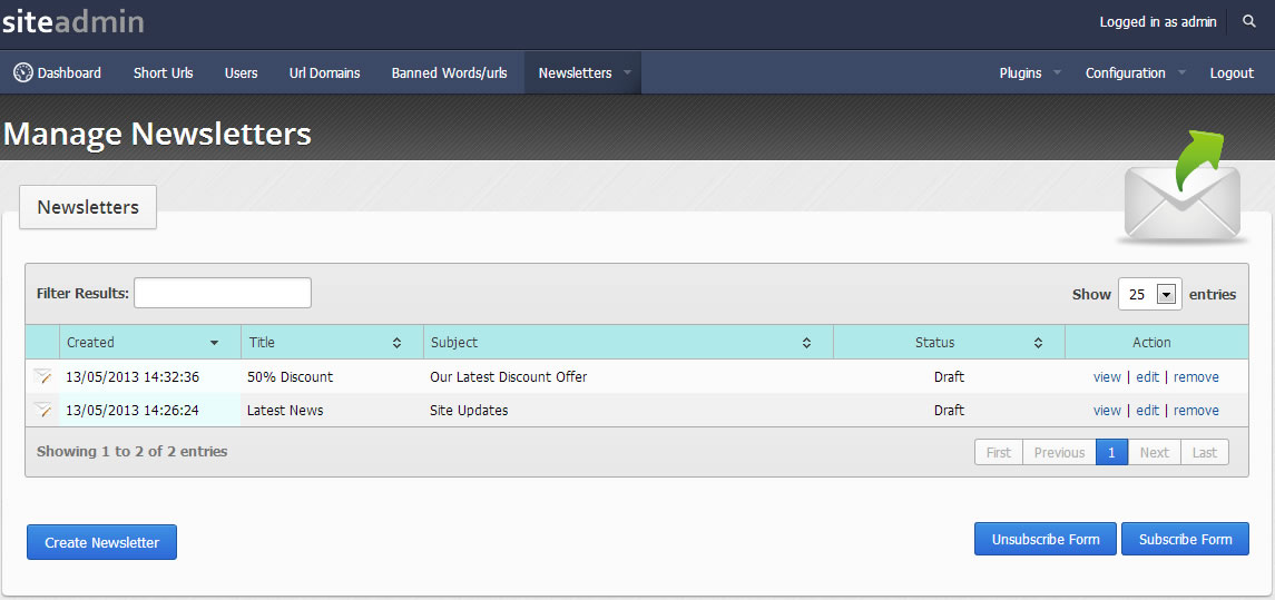 Our newsletter plugin enables you to create, manage and send newsletters to your users. Click on any of the image thumbnails to see screenshots of the plugin.